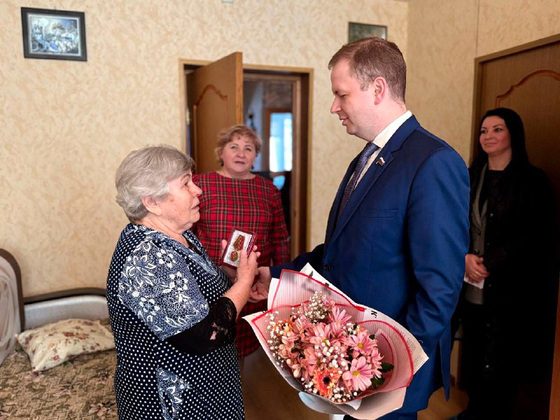 Алексей Говырин вручил Валентине Тихоновне юбилейную медаль к 80-летию Победы и пригласил на гала-концерт фестиваля «Дорога на Ялту» в Москву.