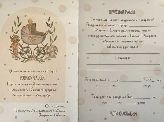 - В разработанных нами открытках указаны первые, самые главные данные о новорожденном: его имя, вес, рост и время рождения. Таким образом, каждый родитель сможет сохранить этот важный момент в жизни своей семьи в красивом и оригинальном формате, - рассказала председатель Законодательного Собрания Владимирской области Ольга Хохлова.