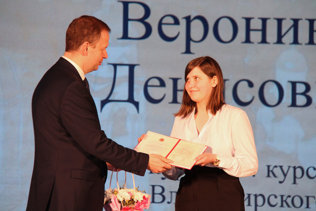 - Стало доброй апрельской традицией чествовать наших стипендиатов, надежд земли владимирской. Ребята прилагают огромное количество усилий, чтобы достигать действительно выдающихся успехов в родной Владимирской области. Это звание - занесение в символическую галерею памяти, важная строчка в портфолио у каждого ученика, школьника, студента, - отметила министр молодежной политики Владимирской области Елена Янина.