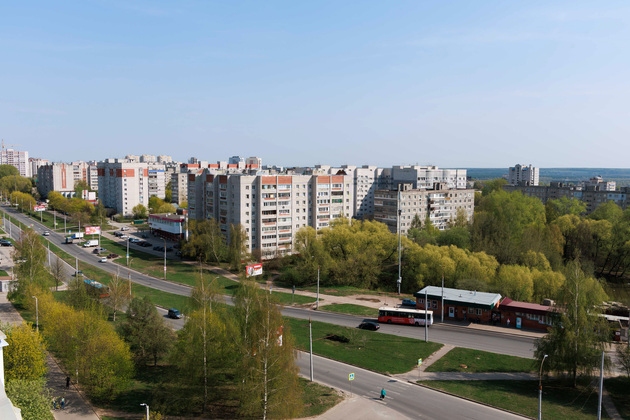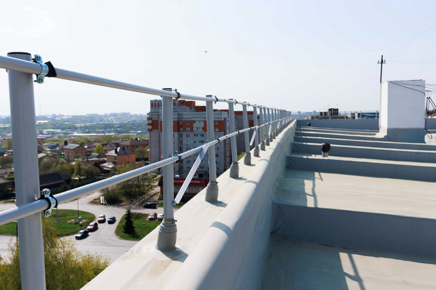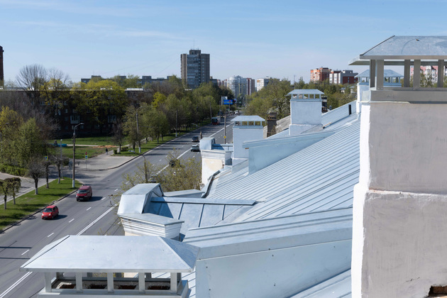 Когда мы приехали на репортаж, рабочие с помощью подъемника доставляли строительные материалы прямо на крышу. Мы поднялись на нее с председателем совета дома и оказались на площадке под ротондой. Отсюда открывается красивый панорамный вид на ВлГУ, на улицу Горького и новые высотки.