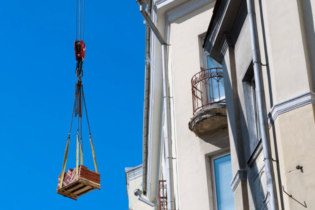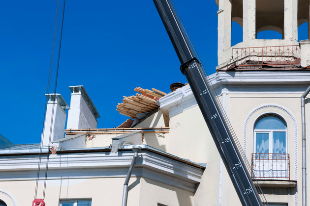 На крыше видны деревянные стропила - покрытие кровли пока отсутствует. Крыша временно изолирована водозащитным мембранным полотном. Тут же стоят палеты с кирпичами. Ремонтникам предстоит восстановить поврежденное ограждение кровли эркера под ротондой и часть парапетов. Еще планируется установить систему снегозадержания со стороны внутреннего двора.