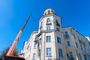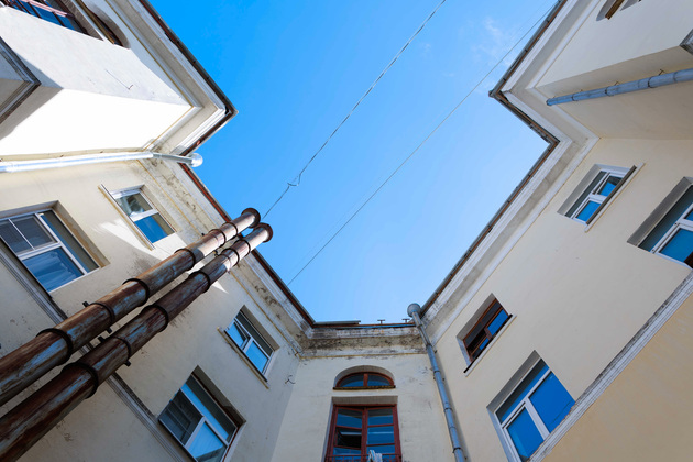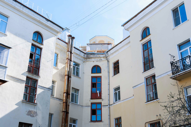 Сейчас в доме тоже идет капитальный ремонт. Рабочие приводят в порядок крышу - старый шифер сменит оцинкованный лист. Уже заменили водостоки, слуховые окна, на чердаках установили огнестойкие металлические двери, изолировали вентиляционные каналы.
