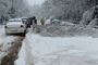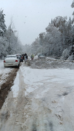 Вдоль дороги нагнулись под тяжестью сырого снега деревья, некоторые упали. Чтобы проехать быстрее, автомобилисты выходят и убирают заторы. Отметим, что колея на дороге довольно внушительная. Тем, кто переобулся, лучше пока остаться на парковке.