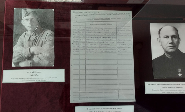 С особой гордостью архивисты вспоминают о двух Героях Советского Союза, которые работали в муниципальных архивах. Один из них - Александр Иосифович Рощин в Киржачском районном архиве, где трудились, кроме него, ещё два участника Великой Отечественной войны. А в Меленковском районном архиве было 6 сотрудников из числа фронтовиков. В том числе - Герой Советского Союза Пётр Павлович Мосин.