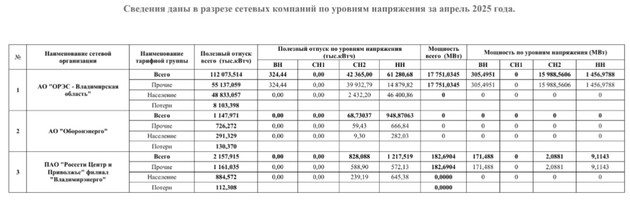 Сведения даны в разрезе сетевых компаний по уровням напряжения за апрель 2025 года.