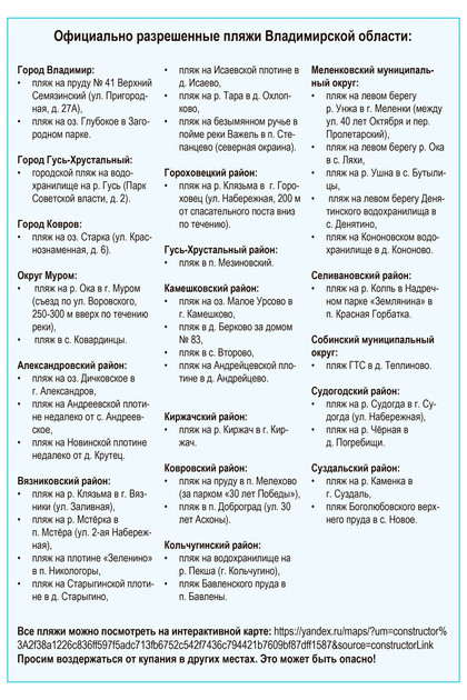 Места отдыха у воды обустраиваются в 17 муниципальных образованиях. Каждый из пляжей прошел освидетельствование в Центре ГИМС Главного управления МЧС России по Владимирской области и соответствуют всем требованиям безопасности. Это означает, что они оснащены по требованиям безопасности, дно проверено водолазами, организовано ежедневное дежурство спасателей.