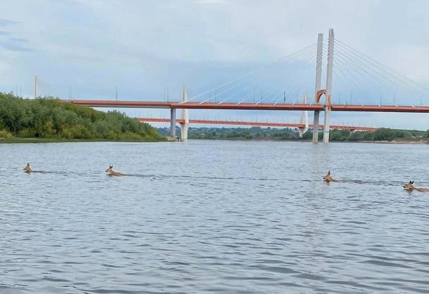 Госохотинспекция Владимирской области в выходные опубликовала интересный кадр: группа косуль переплывает реку Оку в районе моста на автомобильной трассе «М-12 «Восток». Фото сделали местные рыбаки.