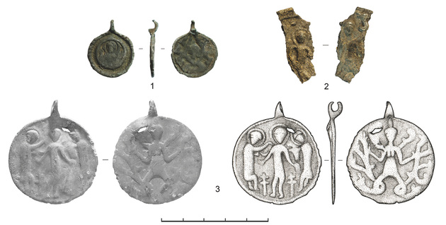 Среди находок весеннего сезона этого года – кресты-тельники редких типов, целая подвеска-змеевик и фрагмент змеевика, ножи, пряслица, оселки, замки и ключи, фрагменты медных котлов, украшения из цветных металлов, стекла и сердолика.