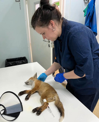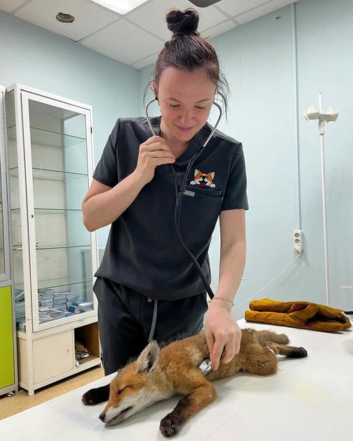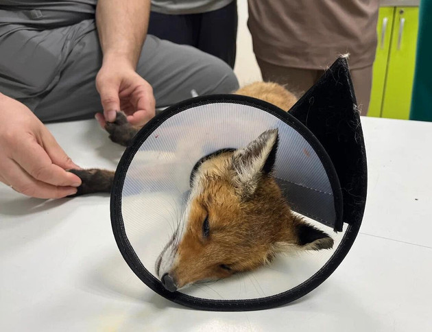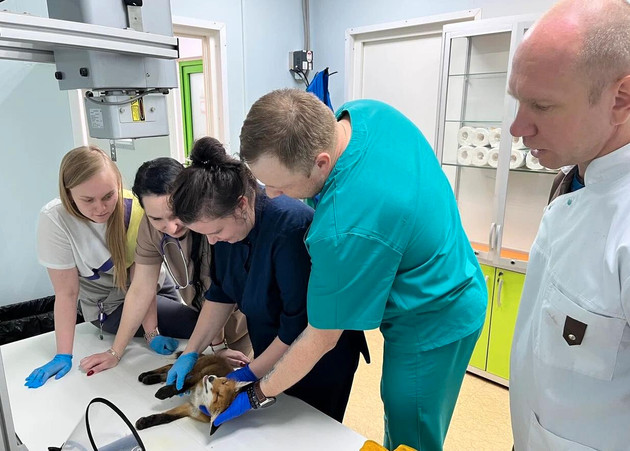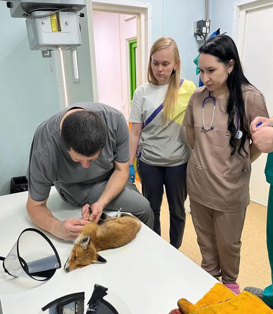 В приюте лисичку решили оперативно отвезти в ветклинику «Артемида». Судя по фотографиям, ветеринарный консилиум собрался солидный. Чтобы спокойно осмотреть рыжего пациента, пришлось дать ему наркоз и обездвижить. Судя по всему, предположили айболиты, он попал в капкан или силок.