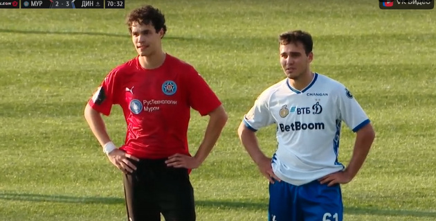 Однако за 5 минут до окончания первого тайма усилия «Мурома» в атаке были вознаграждены назначением пенальти. Одному из динамовцев мяч попал в руку в своей штрафной. Хотя повод для пенальти показался некоторым спорным – футболист был в прыжке спиной к летящему мячу, и игра рукой была, скорее всего, не умышленной.