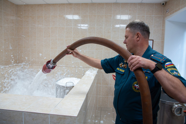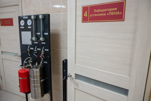 В помещении лаборатории находится установка под названием «Пена», предназначенная для проверки качества пенообразователя. Этот раствор играет ключевую роль в тушении разливов углеводородов, таких как нефть, дизельное топливо и другие виды горючих жидкостей. Особенность таких возгораний заключается в том, что водой их потушить невозможно – из-за большей плотности вода опускается вниз, не оказывая воздействия на очаг пламени. Для борьбы с такими пожарами используется пенообразователь, создающий сверху пенную шапку. Она блокирует доступ воздуха к горящей поверхности, что приводит к прекращению горения.