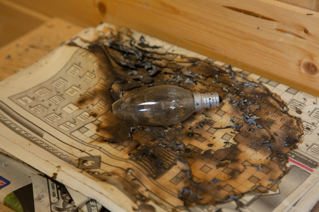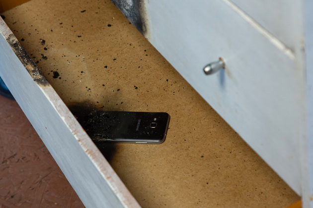 Последний макет был посвящён современной проблеме – самозагоранию литий-ионных батарей. Старые телефоны, зарядные устройства (пауэрбанки), электронные сигареты и другие устройства с такими аккумуляторами могут стать причиной пожара, если их долго оставлять на зарядке или хранить неправильно. Примером стал реальный случай, когда телефон долгое время лежал в комоде, его батарея вздулась, и произошло химическое самозагорание.