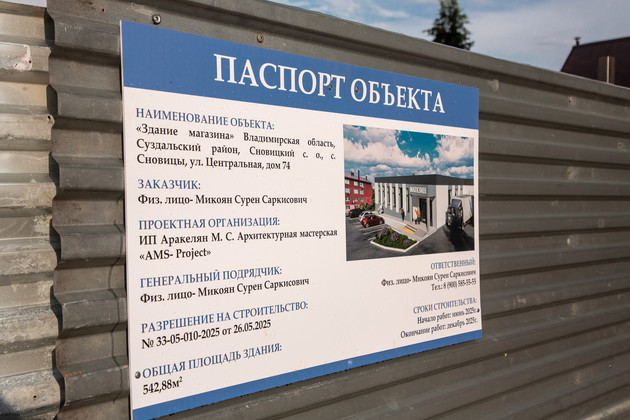 На паспорте объекта появилась информация, что здесь будет магазин общей площадью более 542 квадратных метров. Указан номер разрешения на строительство: 33-05-010-2025 от 25.05. 2025. Окончание работ - декабрь 2025 года.