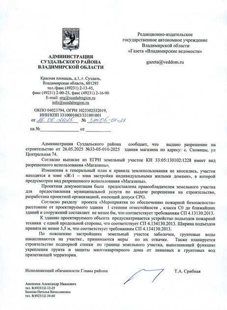«ВВ» направили официальный запрос в администрацию Суздальского района с просьбой дать пояснения по поводу строительства в Сновицах. Ответ пришел за подписью и.о. главы района Татьяны Срибной.