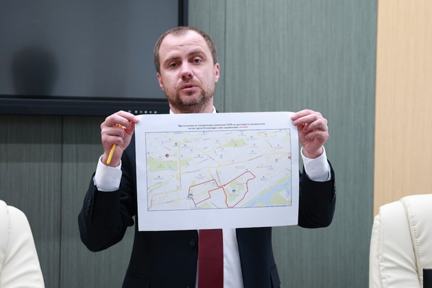 – Но чтобы было понятно, красной линией (см. фото ниже – прав. Ред.) ограничена зона, где движение и размещение будет запрещено. Для удобства жителей, по краям этой зоны, на Большой Московской, 61, на Летне-Перевозинской, здесь мы делаем большие парковки для самокатов, которые будут рассчитаны на от 20 единиц или больше, – объяснил замглавы.