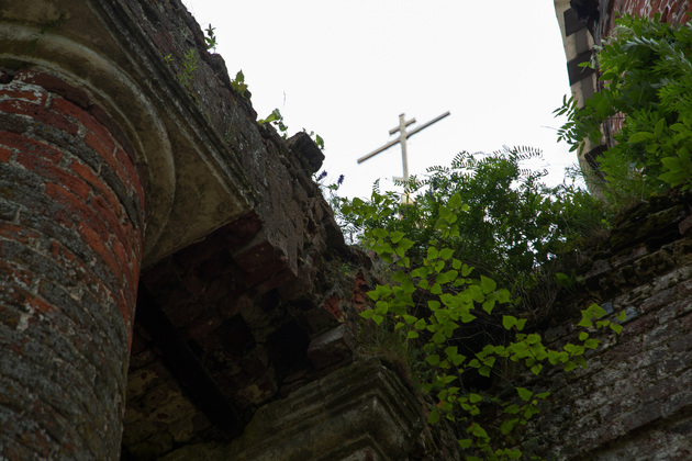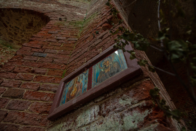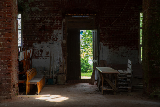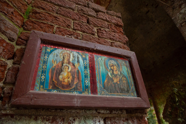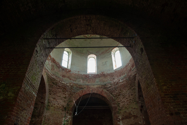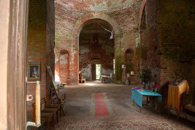 Мы заходим в храм вместе со старостой. Внутри раздается гулкое эхо. Голые кирпичные стены, земляной пол, от фресок и богато украшенного интерьера нет и следа, под сводом выводят пируэты ласточки. Но и сейчас можно представить, как прекрасен был Всехсвятский храм при Суворочке!