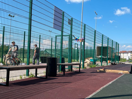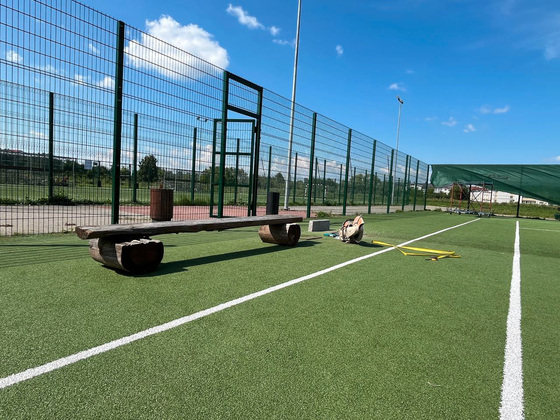 Уже заменено металлическое ограждение по периметру, установлен ветрозащитный фон, обновлены основание для сетки и сама сетка, нанесена свежая разметка, поставлены новые лавочки для переодевания и современные урны.