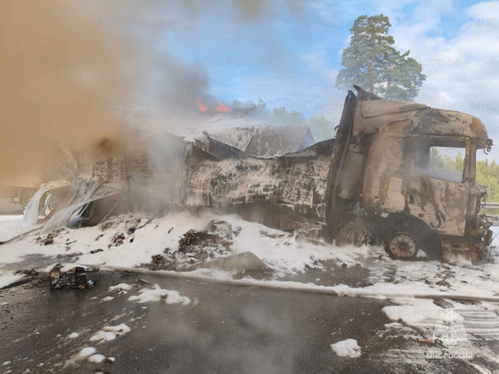 Сотрудники полиции и дознаватели МЧС России выясняют причины крупного пожара на федеральной трассе в Камешковском районе, в результате которой полностью выгорели легковой и грузовой автомобили.