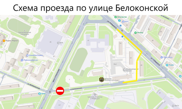 Заезд на ул. Белоконской возможен с ул. Горького у домов №89 и №91.