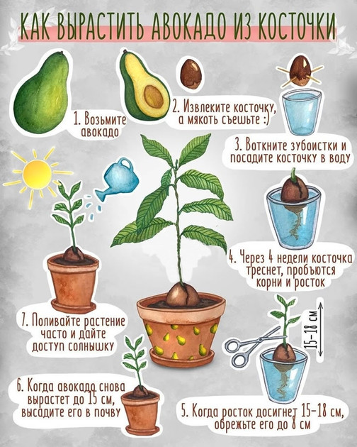 Кстати, вырастить в домашних условиях авокадо можно из косточки. Ниже приводим инфографику Россельхозцентра с пошаговыми рекомендациями, как это сделать.