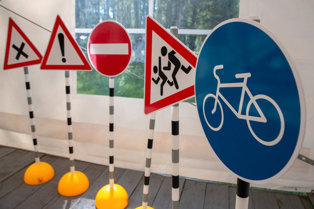 В шатре на уличной территории организованы занятия юных инспекторов дорожного движения. Ребята штудируют теорию и проходят увлекательную практику в городке на велосипедах и самокатах.