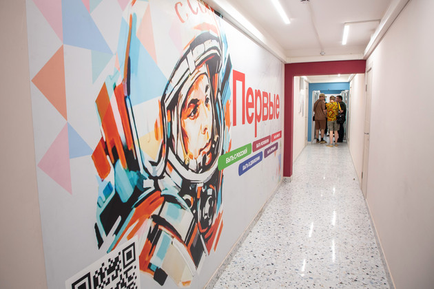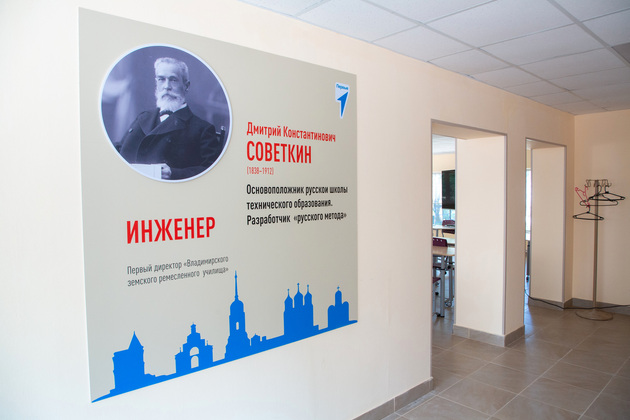 А на стенах помещений для детского досуга - фрески с изображениями выдающихся личностей: Андрея Боголюбского, Александра Суворова, Николая Жуковского, Дмитрия Советкина, Юрия Гагарина.