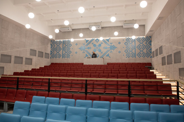 - В актовом зале мы заменили всё, - показывает ремонт Виктор Мазник. - Установили новое проекционное, световое и звуковое оборудование, сиденья, кондиционеры, смонтировали звукоизоляционную обшивку.