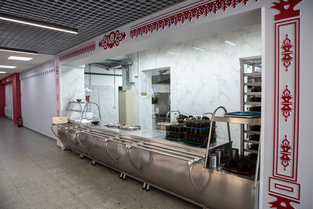 А вот и пищеблок. Стены облицованы плиткой, на полу - керамогранит. Здесь новые системы водоснабжения, канализации и кондиционирования воздуха, варочное оборудование, мебель. На стенах - стилизованный русский орнамент и такие же наличники.