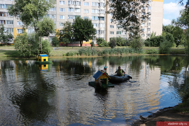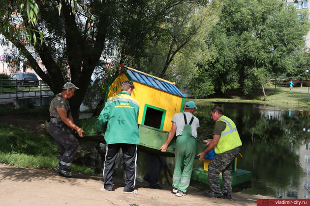 7 августа сотрудники МКУ «Зеленый город» установили уточкам отремонтированные домики. Мастер по обслуживанию парков и скверов МКУ «Зелёный город» Александр Врубель рассказал, что при установке таких шале важно оценить глубину водоема, поскольку в разных частях пруда она варьируется от 1,5 до 3 метров.