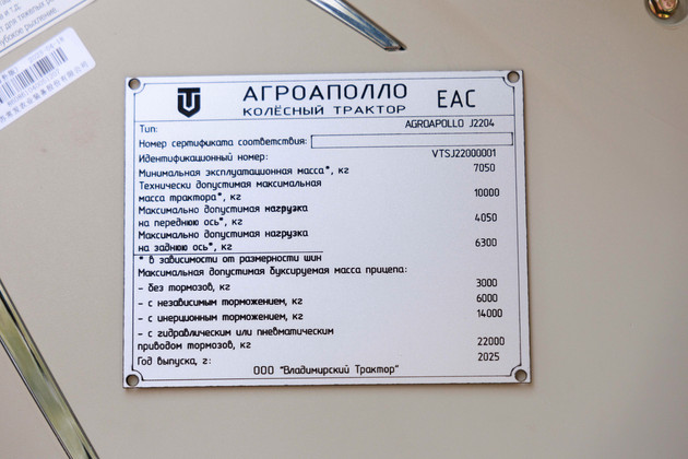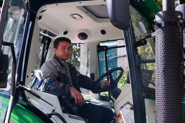 На территории технопарка нам показали одну из моделей трактора «made in Russia», - «АгроАполло J2204» с мощностью двигателя 220 л.с. За рулем - начальник по производству Максим Провидов.
