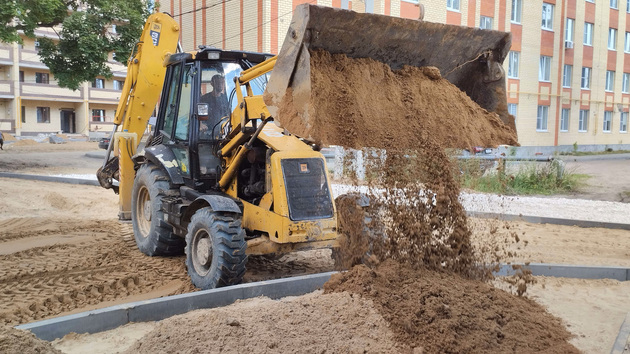 Здесь застаем в самом разгаре планировку, выравнивание установка бордюрного камня, укладку подстилающих слоев. Задействована техника — экскаватор-погрузчик и верткий мини-трактор. Они развозят песок в нужные места. Трудятся пешие рабочие с лопатами и другими инструментами.