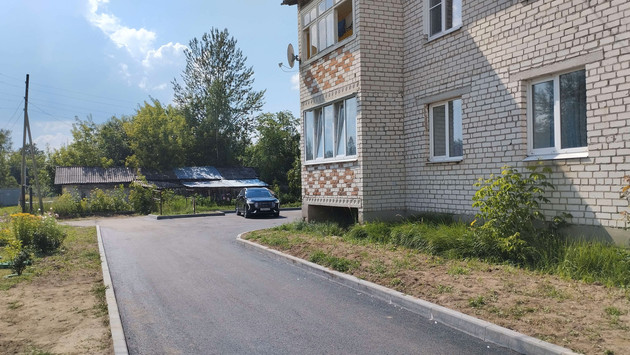 Едем в обновленный двор дома №108 на улице Ленинградской. На момент нашего приезда работы находились уже в финальной стадии. Видно, что у двухэтажного дома заасфальтирован дворовый проезд, походы к подъездам, сделан тротуар с одной стороны дома для безопасного прохода жителей. Расширилось место под парковку. Оставалось только установить урны и новые скамейки.