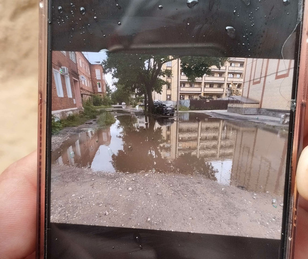 Сейчас уже трудно поверить, что за десятилетия асфальтовое покрытие во дворе уже во многом стертлось, а посередине двора стояла вечная огромная лужа. Связано образование луж еще с тем, что в Киржаче исторически нет ливневой канализации. Так что подрядчикам приходится много потрудиться, чтобы заложить нужный уклон при обновлении дворов, иначе вода будет снова копиться уже на новом асфальте.