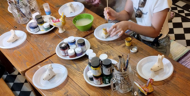 Потом спускаемся в подвальный этаж, где выставлены в основном матрешки. И тоже там большой стол, только со всем необходимым для мастер-класса по росписи игрушек.