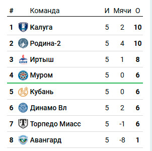 Теперь «Муром» набрал 6 очков и вышел на 4-е место. Столько же имеют «Кубань», «Динамо-Владивосток» и «Торпедо Миасс».