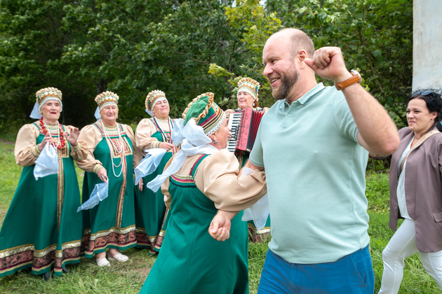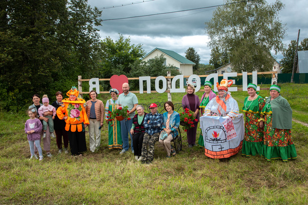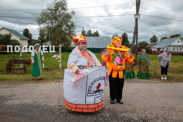 Тем временем на центральной площадке начинается народная программа. А затем ‑ традиционные игры. Одна из них ‑ надевание тканевых калачей на ухваты. Смех, шутки, азарт, видно, что праздник для жителей Подольца ‑ не только конкурс, но и настоящий повод собраться вместе.
