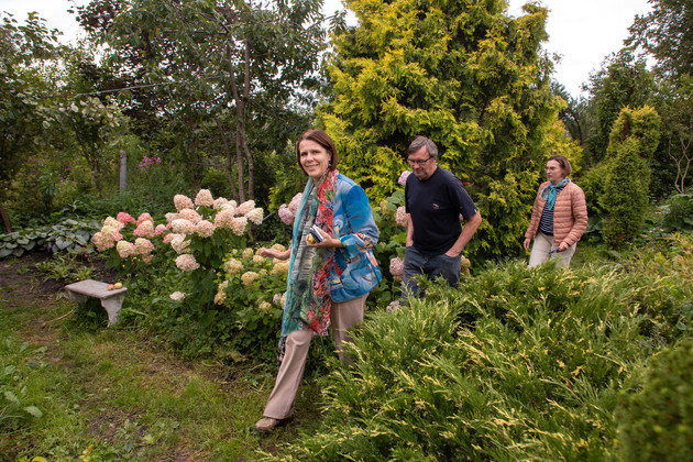 Затем мы направились в сад одного из местных жителей, который стал неформальной достопримечательностью села. Нас встречает Алексей Сущенко ‑ человек с золотыми руками и настоящей любовью к земле. На его участке ‑ целый ботанический мир: георгины, гортензии, фруктовые деревья, ягоды. Он с улыбкой объясняет, что уход за растениями у него получается «по-деревенски органическим» ‑ удобрять просто не доходят руки, но при этом всё растет и плодоносит.