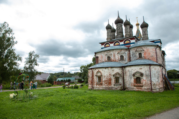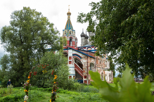 В центре внимания ‑ храм Троицы Живоначальной, построенный в 1659 году. В день нашего визита как раз отмечался Медовый Спас, и в церкви шла служба. Храм оказался двухэтажным, с каменной колокольней и четырьмя престолами ‑ редкость для Владимирской области. В прошлом село принадлежало роду князей Милославских, богатство которых позволило построить такой храм в XVII веке.