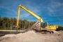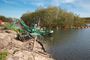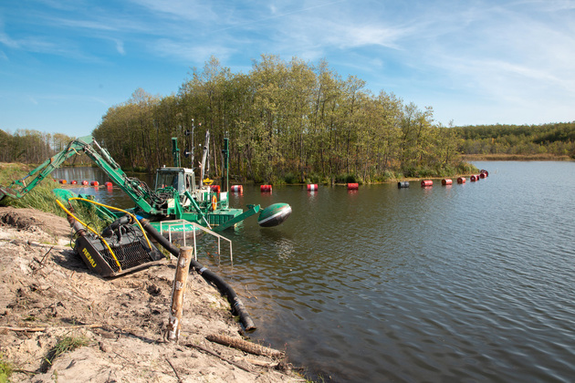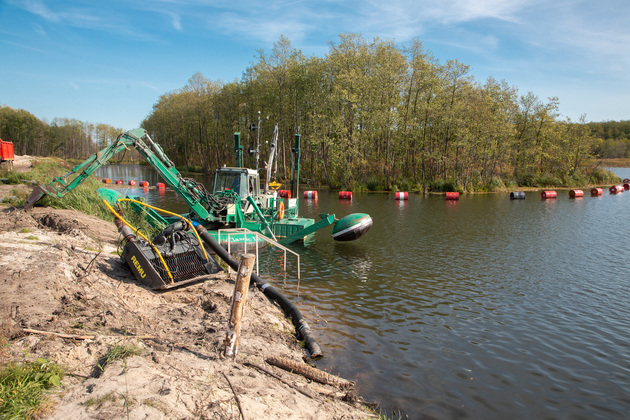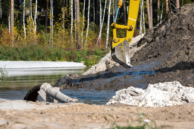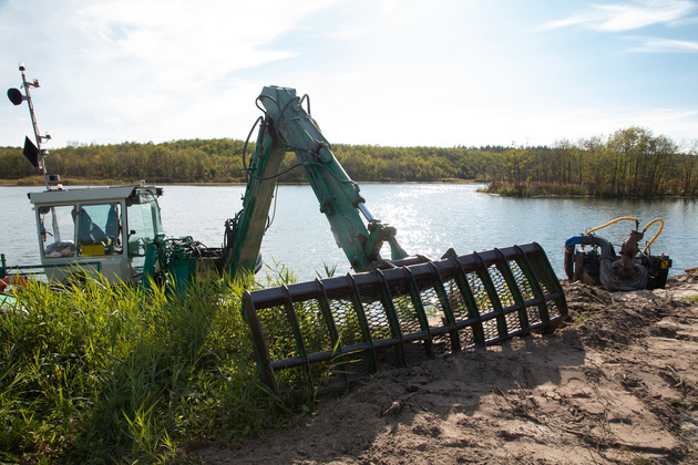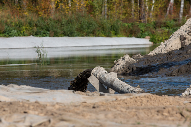 Сейчас очистка русла идет с помощью двух земснарядов - так называются плавучие судна, оснащенные специальным оборудованием для всасывания и транспортировки донного грунта. Иловые отложения, песок и торф поступают на сушу по трубопроводу протяженностью порядка 400 метров. Затем всё это содержимое вывозят на полигон.