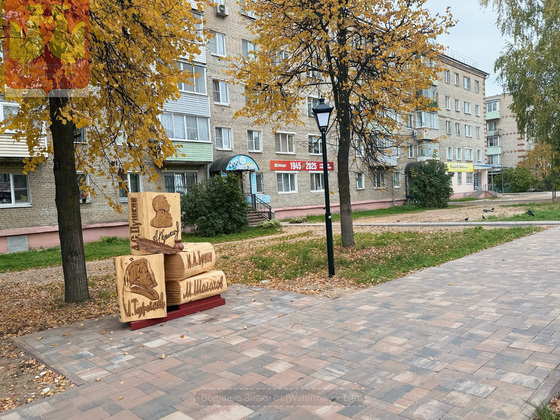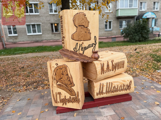 Он установлен на улице Маяковского и представляет собой четыре тома книг, перо и чернильницу. Все выполнено из массива дерева. Книги напоминают горожанам и туристам о бессмертной классике - творчестве Александра Пушкина, Ивана Тургенева, Михаила Шолохова и Ивана Бунина.