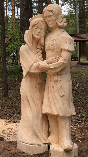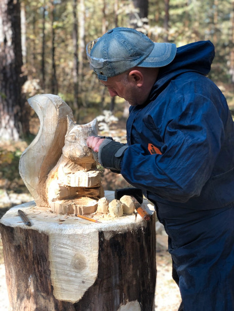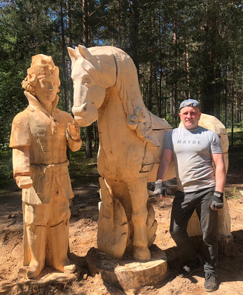 Поскольку работы у Игоря монументальные, он творит в основном не с помощью стамески, а использует бензопилу и болгарку. Самая оптимальная древесина - это сосна, мягкая и податливая.