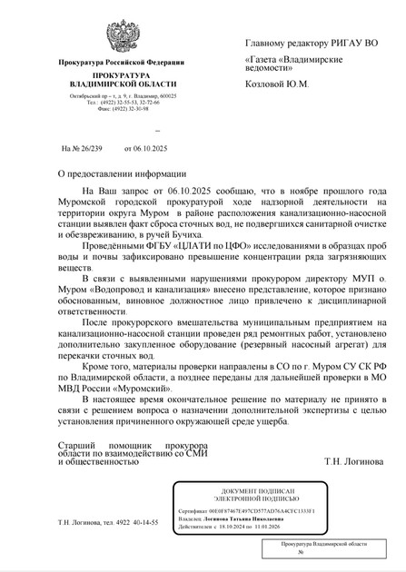 «После прокурорского вмешательства муниципальным предприятием на канализационно-насосной станции проведен ряд ремонтных работ, установлено дополнительно закупленное оборудование (резервный насосный агрегат) для перекачки сточных вод. Кроме того, материалы проверки направлены в следственный отдел по городу Мурому СУ СК РФ по Владимирской области, а позднее переданы для дальнейшей проверки в межмуниципальный отдел МВД России «Муромский». В настоящее время окончательное решение по материалу не принято в связи с решением вопроса о назначении дополнительной экспертизы с целью установления причиненного окружающей среде ущерба», - сообщает официальное ведомство.