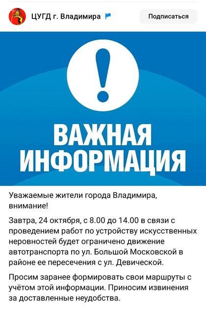«Центр управления городскими дорогами» в четверг вечером сообщает об ограничении движения транспорта на улице Большая Московская в районе перекрестка с улицей Девической в самом центре Владимира. Ограничения будут введены в пятницу, 24 октября, с 8 утра до 14 часов.