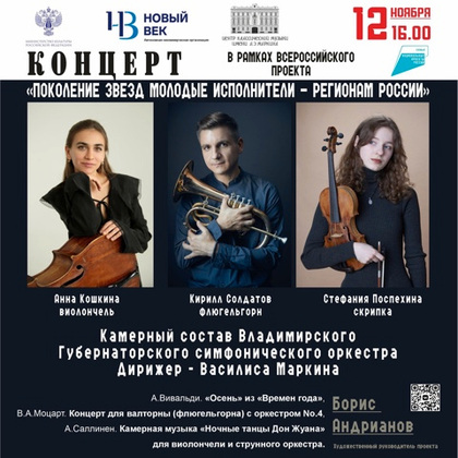 На сцене Центра классической музыки - участники Всероссийского проекта "Поколение звёзд. Молодые дарования - регионам России" вместе с камерным составом Владимирского Губернаторского симфонического оркестра под управлением Василисы Маркиной.