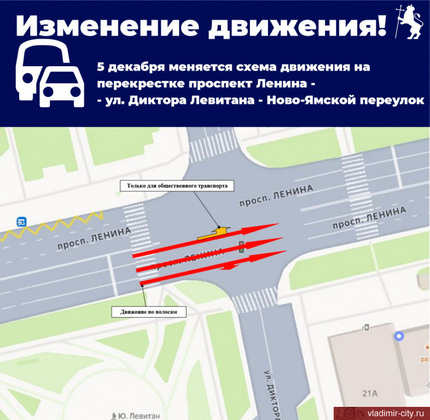 С восьми вечера 5 декабря меняется схема движения на перекрестке проспекта Ленина, улицы Диктора Левитана и Ново-Ямского переулка. Начинает действовать запрет поворота налево с проспекта Ленина на Ново-Ямской переулок.
