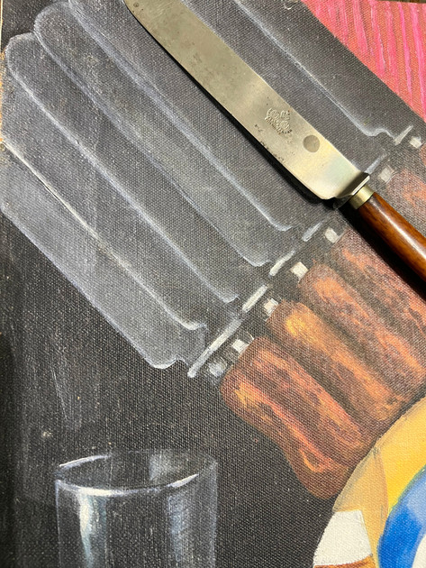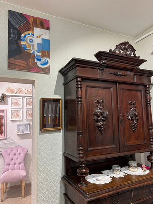 А почему, собственно, эту работу Розановой решили показывать владимирцам? Дело в том, что недавно в музее появился старинный буфет, принадлежавший семье художницы, которая, как известно, одно время проживала во Владимире. Внутри этого буфета находились ножи, изображенные на картине «Буфет с посудой». Эти самые ножи, ставшие основой для произведения искусства, теперь экспонируются вместе с копией картины.