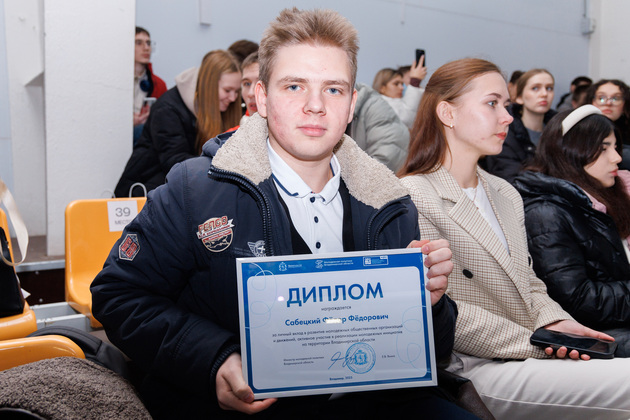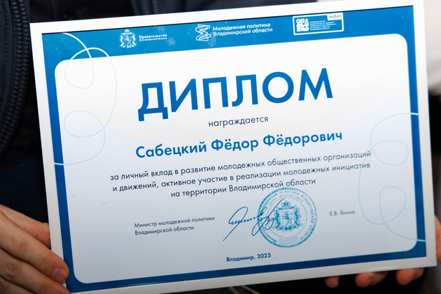 Знакомимся с одним из многих награжденных. Федор Сабецкий, как и другие ребята, получил диплом за подписью министра Елены Яниной с формулировкой: «За личный вклад в развитие молодежных общественных организаций и движений, активное участие в реализации молодежных инициатив на территории Владимирской области». Федор - студент 3-го курса Александровского промышленно-правового колледжа, обучающийся по программе «Правоохранительная деятельность». И особо значимых результатов уже не первый год Федор достигает в науке, особенно истории. Отличился в олимпиаде и крупном конкурсе по истории в ВлГУ. Стал также призером регионального этапа Всероссийского конкурса сочинений «Без срока давности» по истории Великой Отечественной войны.