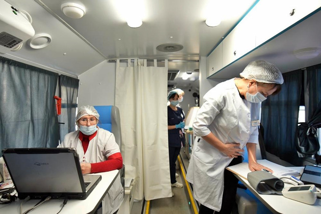 Комплекс создан на базе отечественного компактного автобуса. В нем могут работать до восьми специалистов, производящих забор крови. Оснащение комплекса самое современное.