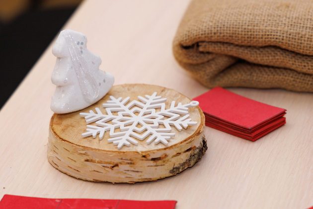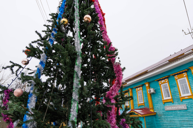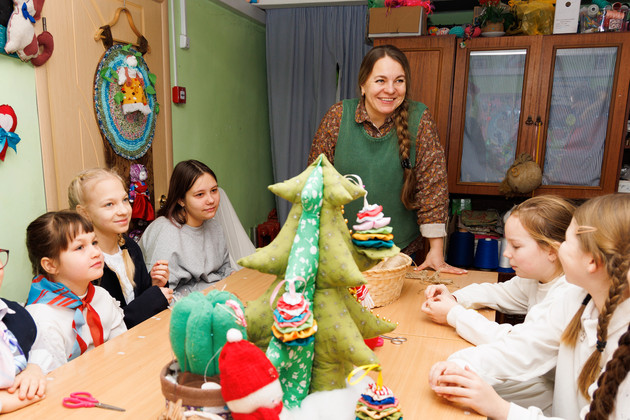 Здесь тоже полным ходом идет подготовка к главному зимнему празднику. Сотрудники ДК наряжают трехметровую искусственную ель, дети создают новогодние сувениры на мастер-классе. Кружок ведет Оксана Владимировна.