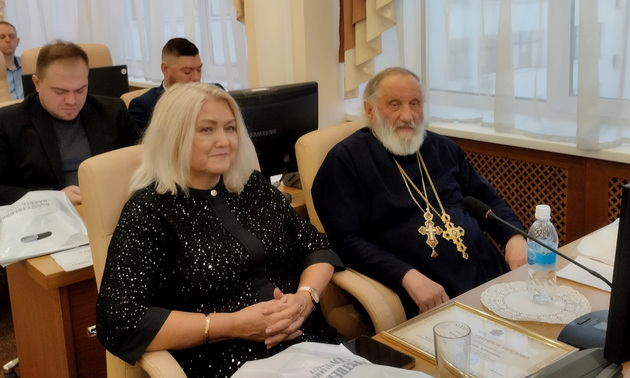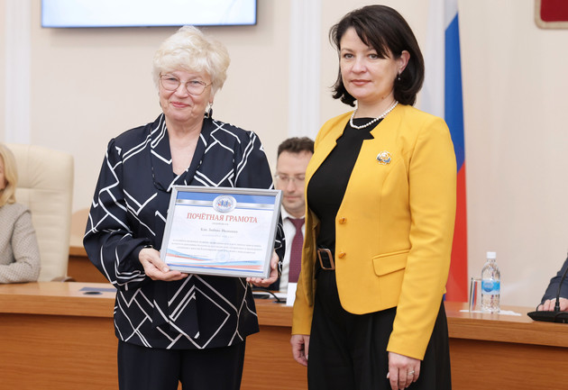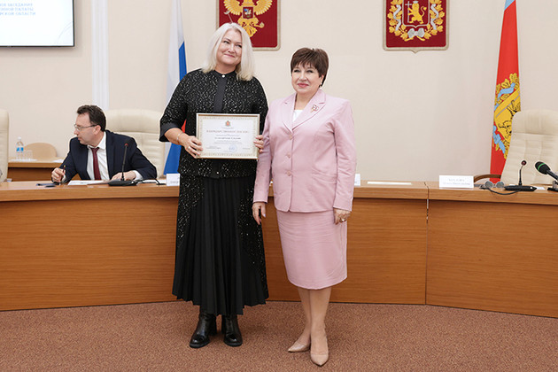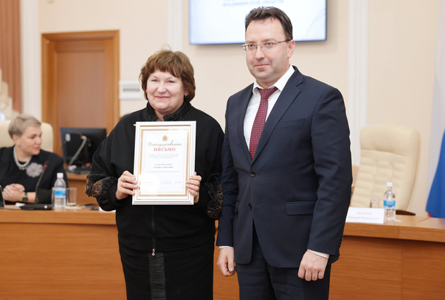 Ольга Хохлова наградила председателя Общественной палаты Владимирской области Анатолия Аннина и члену Общественной палаты Галине Коньковой благодарственными письмами Законодательного Собрания за активную общественную деятельность, значительный вклад в сохранение исторической памяти и патриотическое воспитание подрастающего поколения.